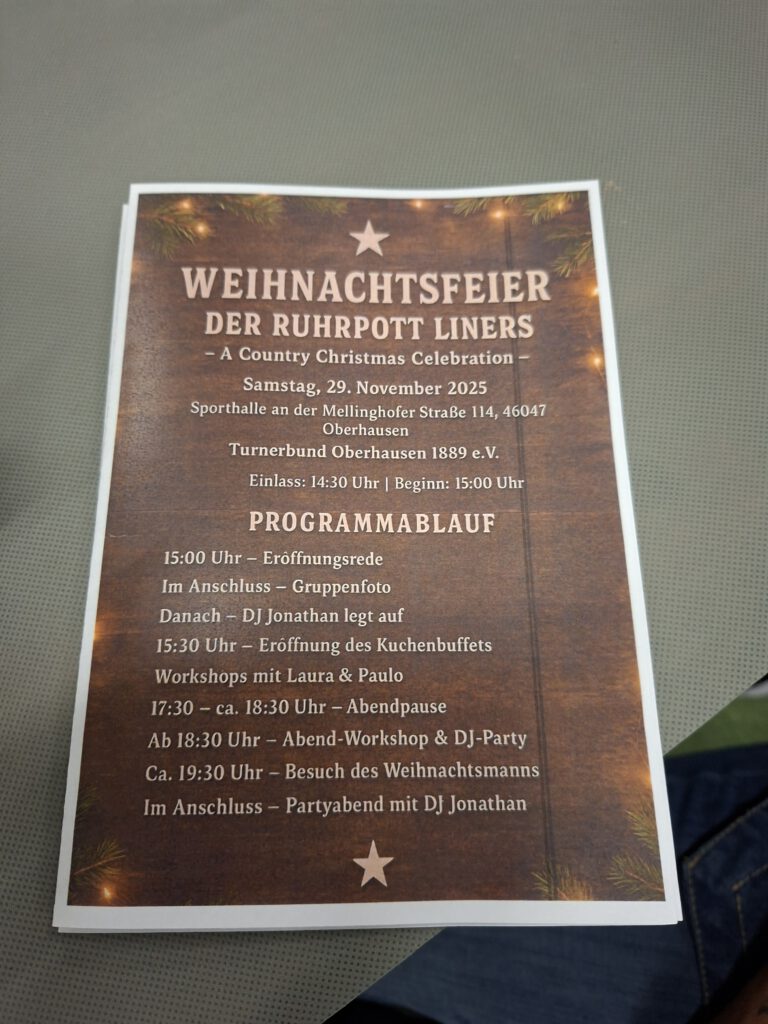 Ende November ging es für einige der Rheindancers nach Oberhausen. Wir feierten mit den Ruhrpott Liners eine tolle Weihnachtsfeier /Party. Paulo Gomes gab zwei Workshops und der Dj brachte unsere Füsse zum Qualmen. Wir tanzten bis in den späten Abend und wurden mit gutem Essen, viel Spass und Geschenken verwöhnt. Es kam sogar der Nikolaus und der Grinch und brachten selbst die Erwachsenen Augen zum strahlen. Wir kommen bestimmt nächstes Jahr wieder.